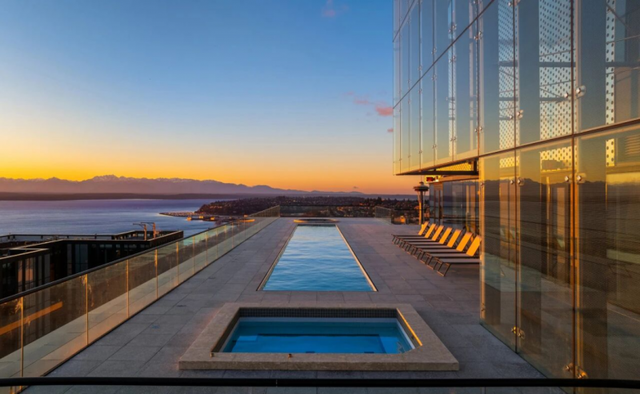 位于47层的天际会所,打造了西海岸唯一的天际泳池,270°环幕视野,可以俯瞰西雅图城景和海湾全景。